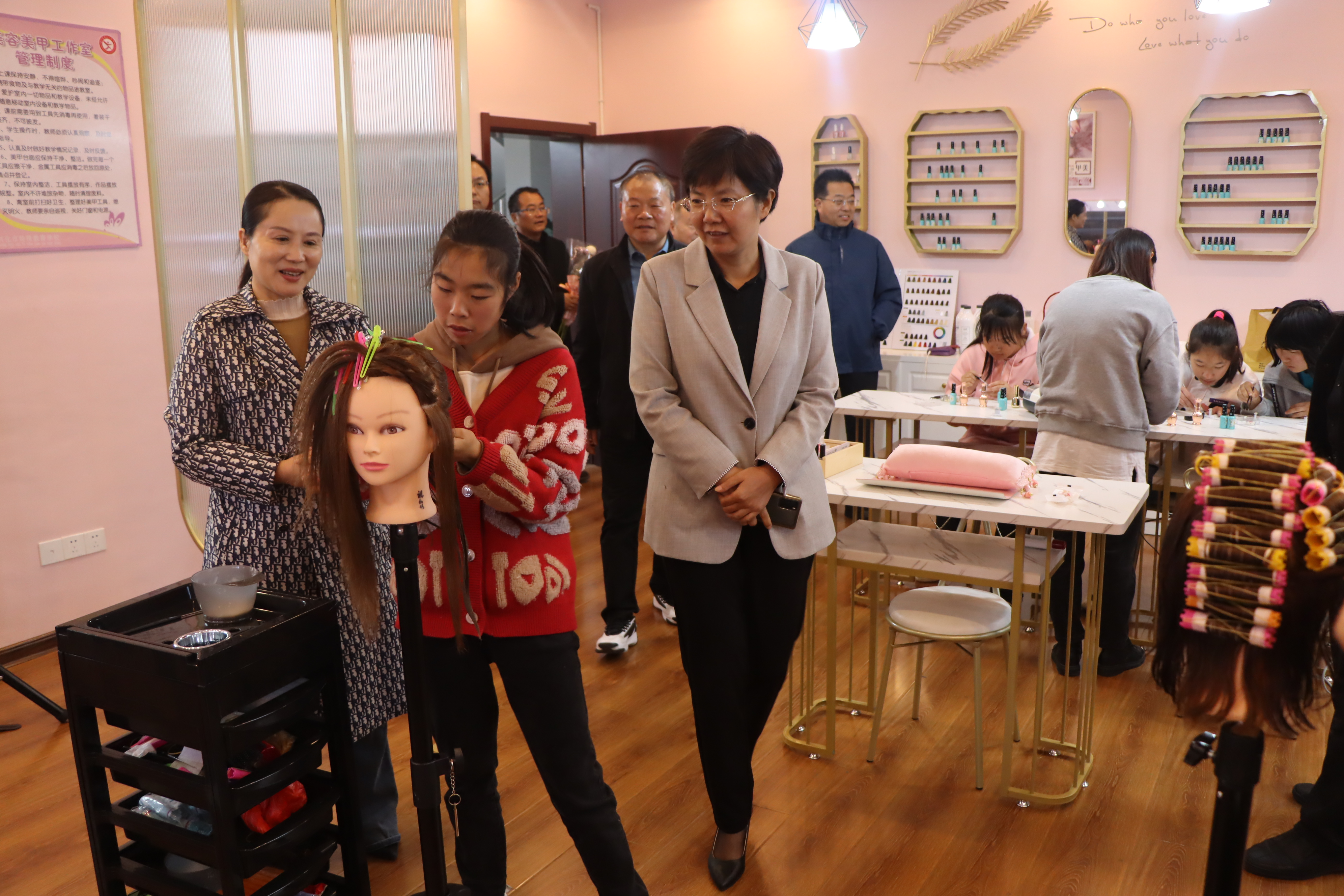 随后观摩了学校的职训课。美发、美甲、茶艺、花艺、烘焙、汽车美容等职训课,让委员们深深感受到学校领导和老师们为了特殊学生的发展用心、用情、用力。